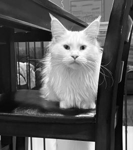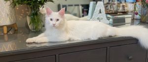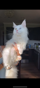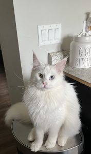 Aspen is our absolutely stunning solid snow white standard Maine Coon with European Bloodlines. She is TICA Registered and we have raised her from a kitten and have been very impressed with her growth and beauty. She has the much sought after and unique heterochromia trait with one blue eye and one yellow eye. She is very playful and absolutely loves our cat tunnels, playing fetch and a good nap! She is just as majestic in attitude as she is in looks deciding when you are worthy of her attention. She does love to cuddle on the couch, on her schedule of course.