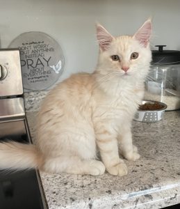Cheyenne is very unique creme colored polydactyly girl and is TICA Registered and comes from European and American bloodlines. She is an absolute sweetheart and easily entertained by anything moving. She marches to the beat of her own drum and is a joy to watch her playing with our other Maine Coons especially Creed. She doesn’t know how small she is ( just a kitten ) and will play as hard as any of the other cats want to play. She is full of life and an absolutely joy to watch zoom around the house. She absolutely loves the water and is well socialized and scared of nothing. Cheyenne is an absolute sweetheart and loves to cuddle in bed or on the couch.