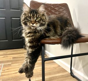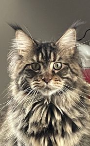 Taurus is a TICA Registered beautiful green eyed classic brown Tabby that is polydactyly. Taurus is very majestic looking and loves to pose for photos. She absolutely loves to be a snuggle buddy and looks forward to bedtime. This beautiful girl came to us from Bulgaria in early 2024. Taurus is very loving ,very playful and most of all extremely social. Taurus has a long thick coat of hair on her body and tail and an absolutely beautiful mane that is still developing. She enjoys stalking and playing with our other Maine Coons.